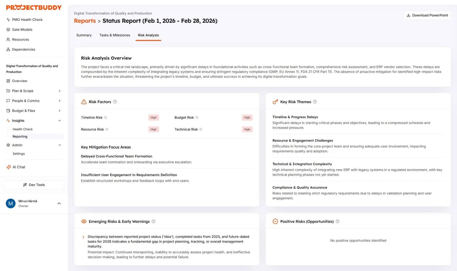 ProjectBuddy highlights deviations and suggests solutions before problems grow.