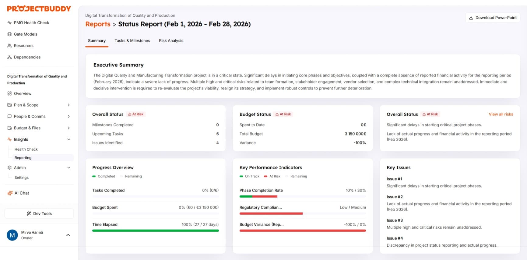 ProjectBuddy highlights deviations and suggests solutions before problems grow.